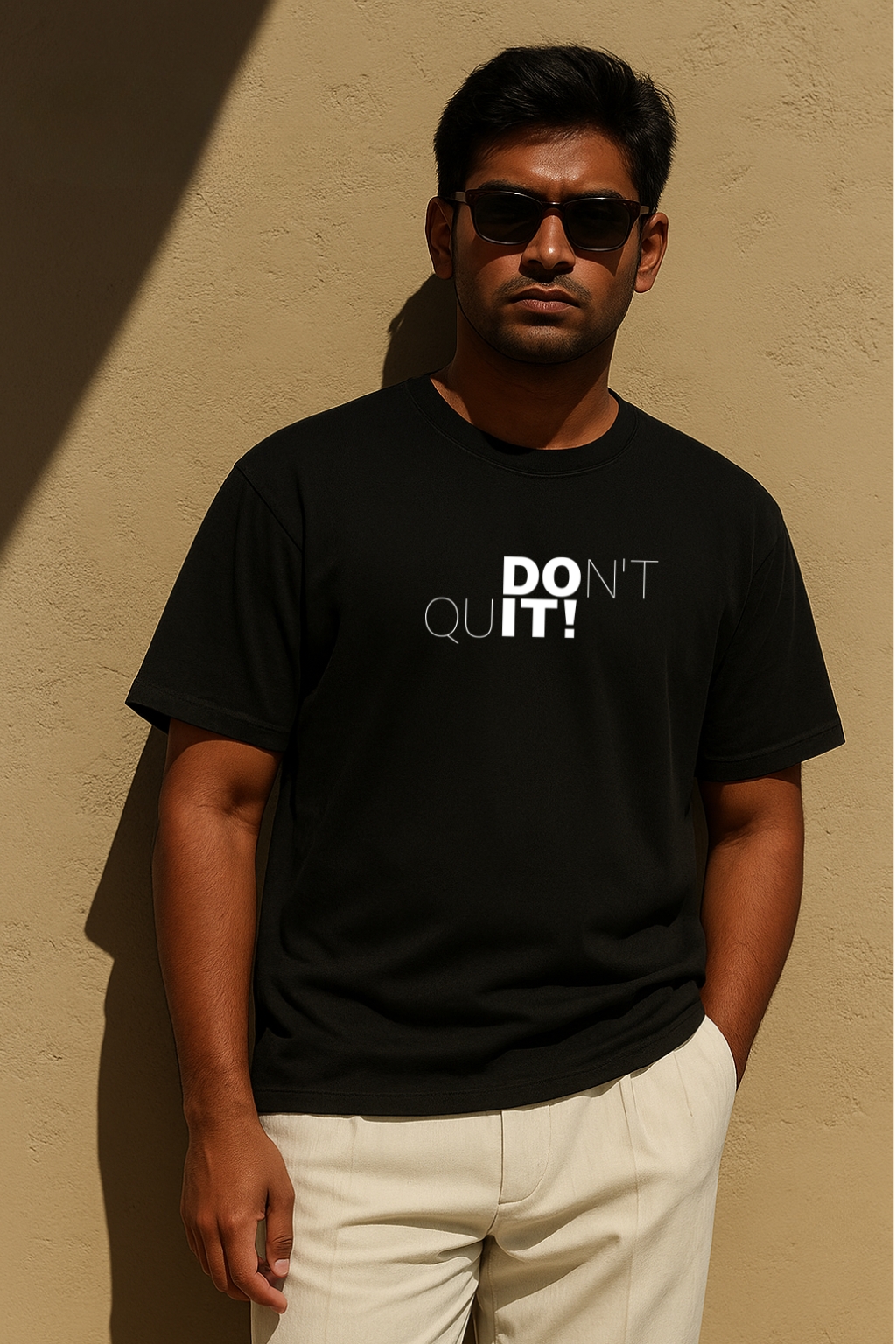 • Minimal motivational print – “DON’T QUIT!” in clean white type