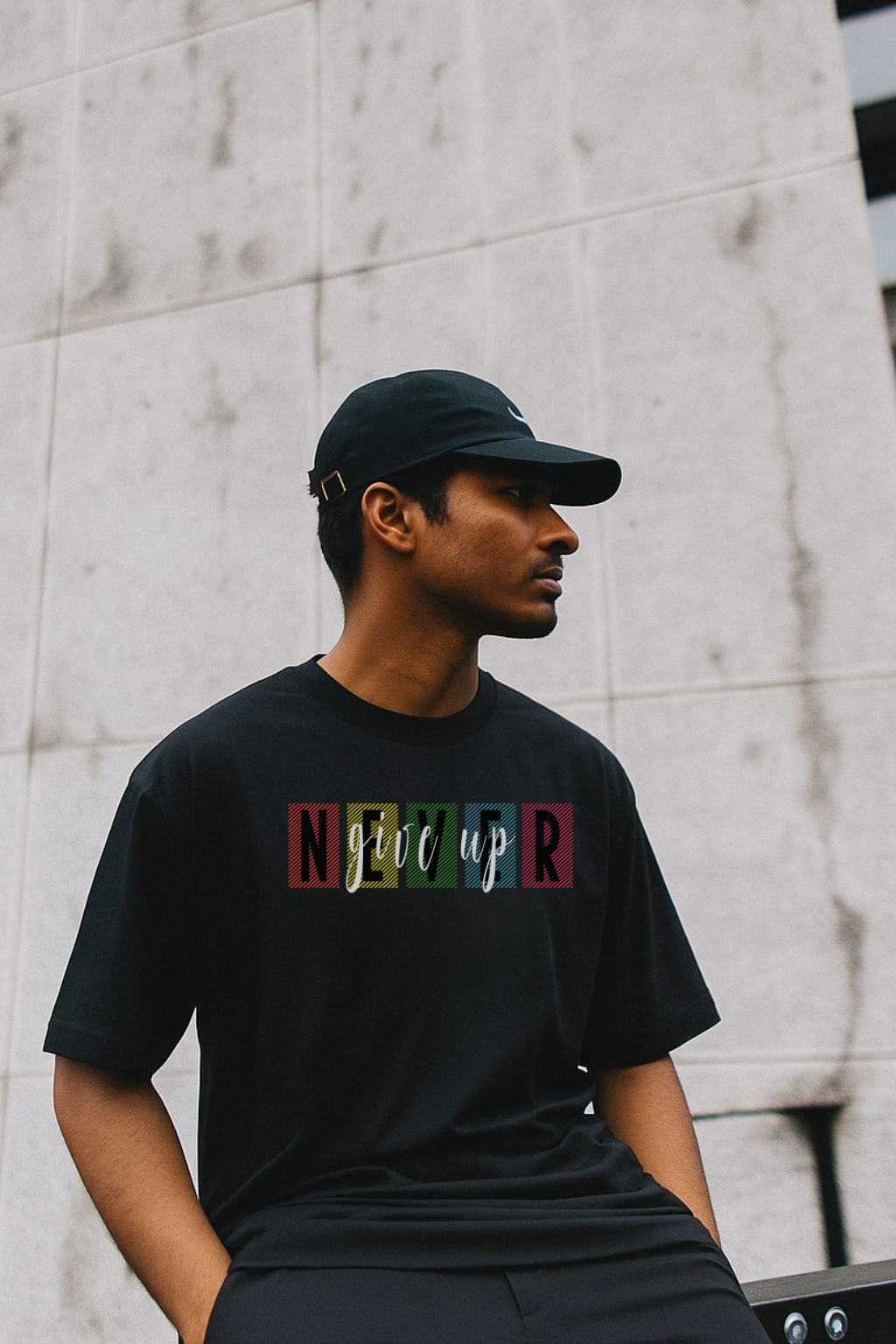 The Never Give Up Oversized Unisex T-Shirt is a statement of confidence and determination. Made with premium 190 GSM soft cotton, it offers lightweight comfort and a relaxed streetwear fit