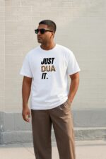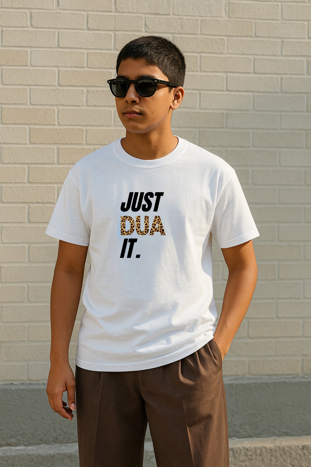 The unique “JUST DUA IT.” print — featuring a leopard-pattern “DUA” — turns everyday wear into a statement of positivity and faith.