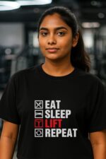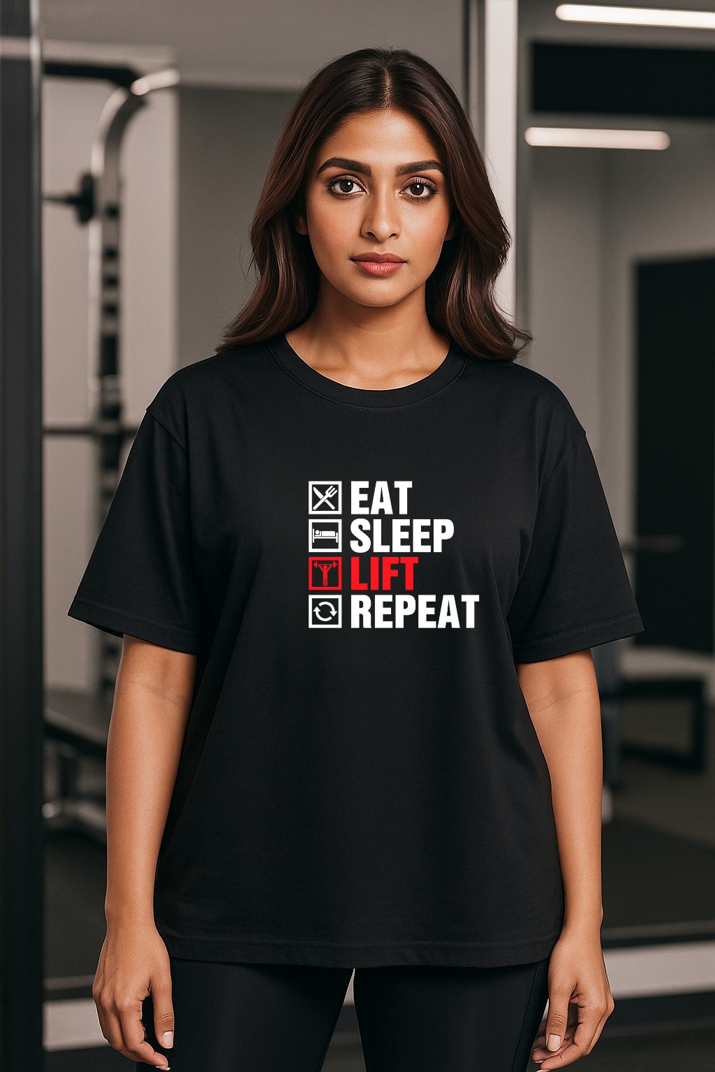 Power through your goals in style with our “Eat Sleep Lift Repeat” black oversized T-shirt — made for those who live and breathe the gym lifestyle.