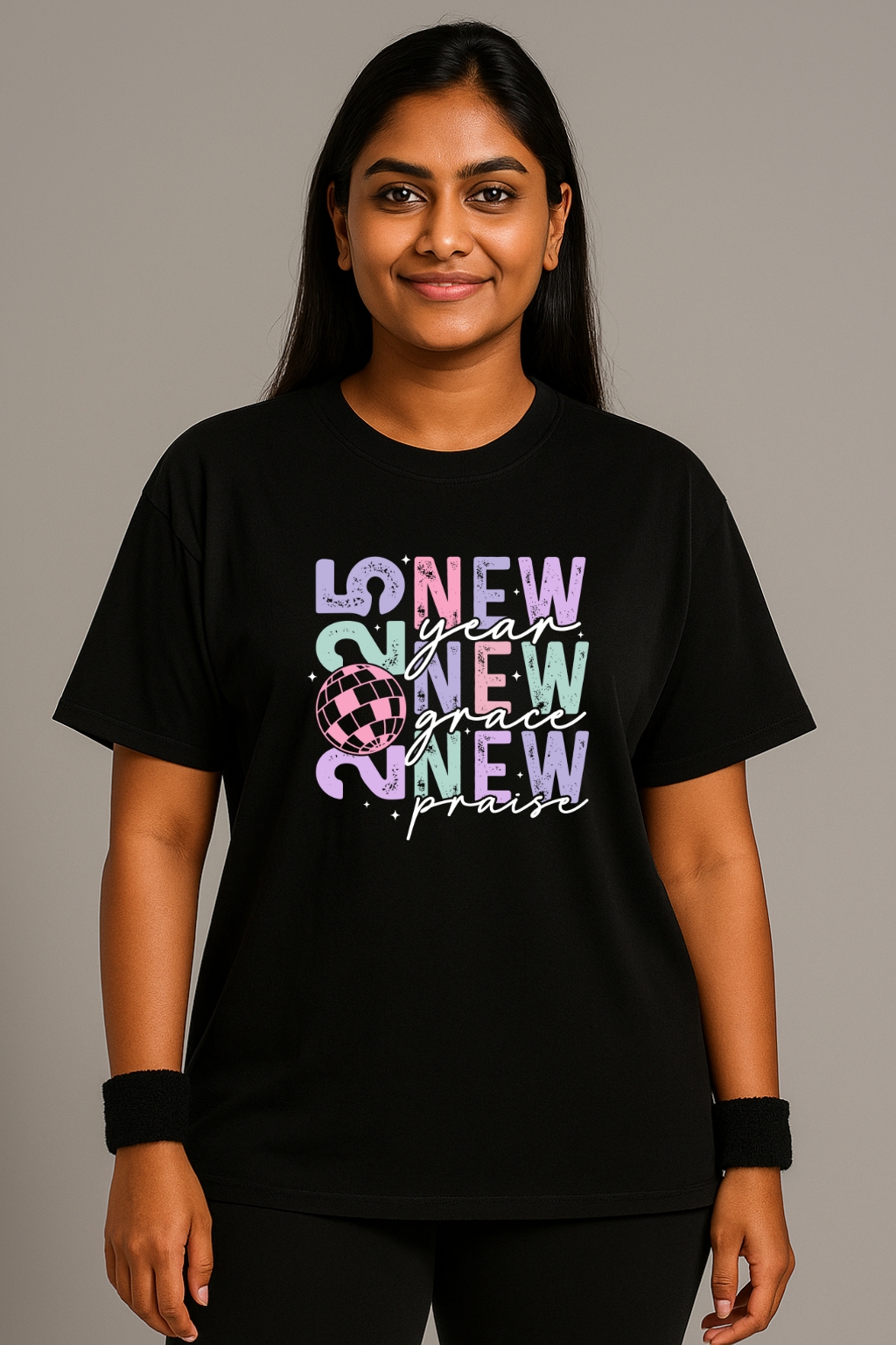 New Year, New Grace, New Praise” print. Perfect for casual wear, gym sessions, or weekend outings.