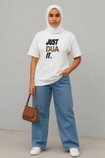 The unique “JUST DUA IT.” print — featuring a leopard-pattern “DUA” — turns everyday wear into a statement of positivity and faith.